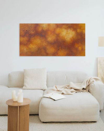 This painting captures the essence of Brazil's coastal beauty using a mix of acrylic paint, sand from its beaches, and handmade urucum pigment. The painting portrays the warm, dark orange tones reminiscent of Brazil's landscape, evoking the earthy richness of its terrain.